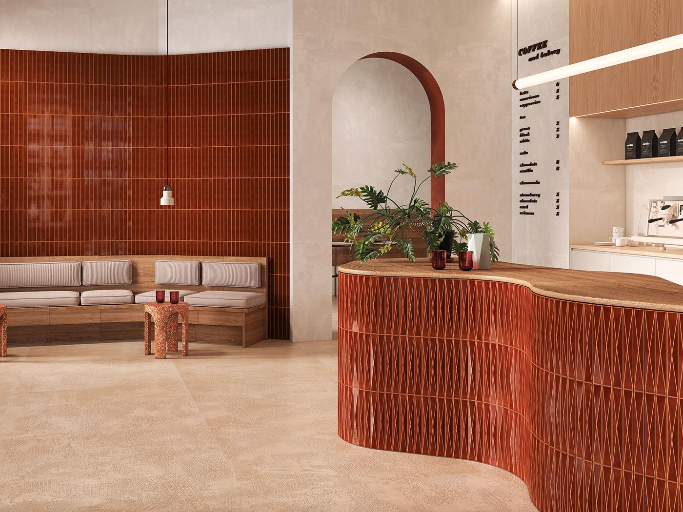 4. Style and Finish layering: For added depth into a room don't be afraid to mix a natural stone with a contemporary textured or 3D small format tile, be bold and beautiful with warm neutrals making a comeback in 2025.