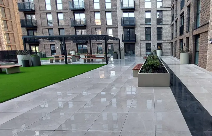 The Berkeley Square project was completed six weeks ahead of programme, with the contractor attributing this achievement to the use of Keystone’s wind uplift system. We are proud to have supported this development through the supply of high-quality external porcelain paving and specialist technical systems, including a fully specified and tested wind uplift solution.